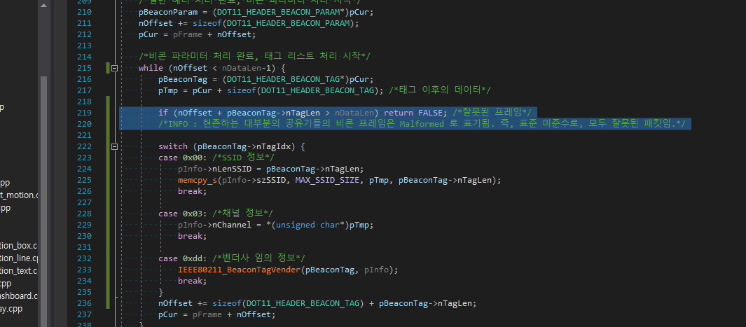 위의 저 데이터덩어리들은 Iptime 의 공유기가 송신해온 비콘 신호인데, 저놈을 파싱하면 프로그램이 죽는다.