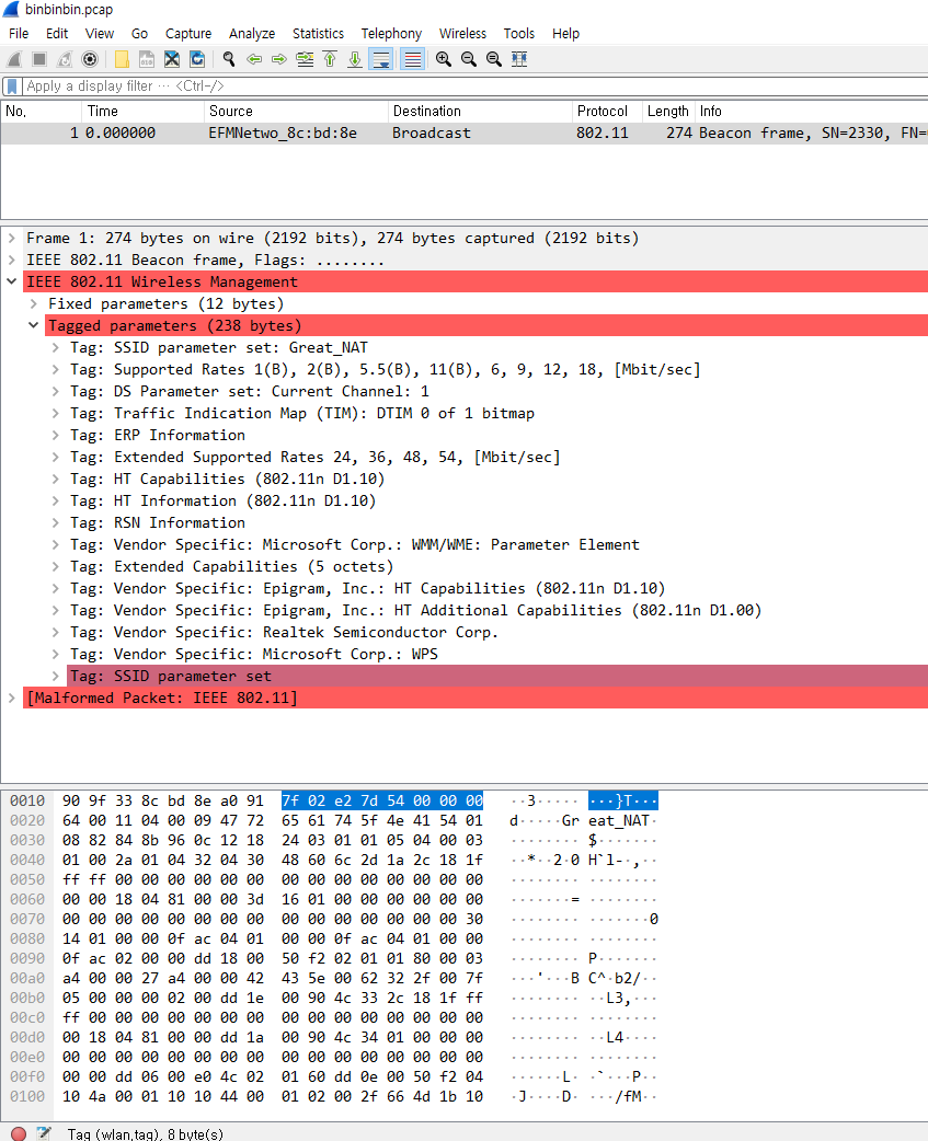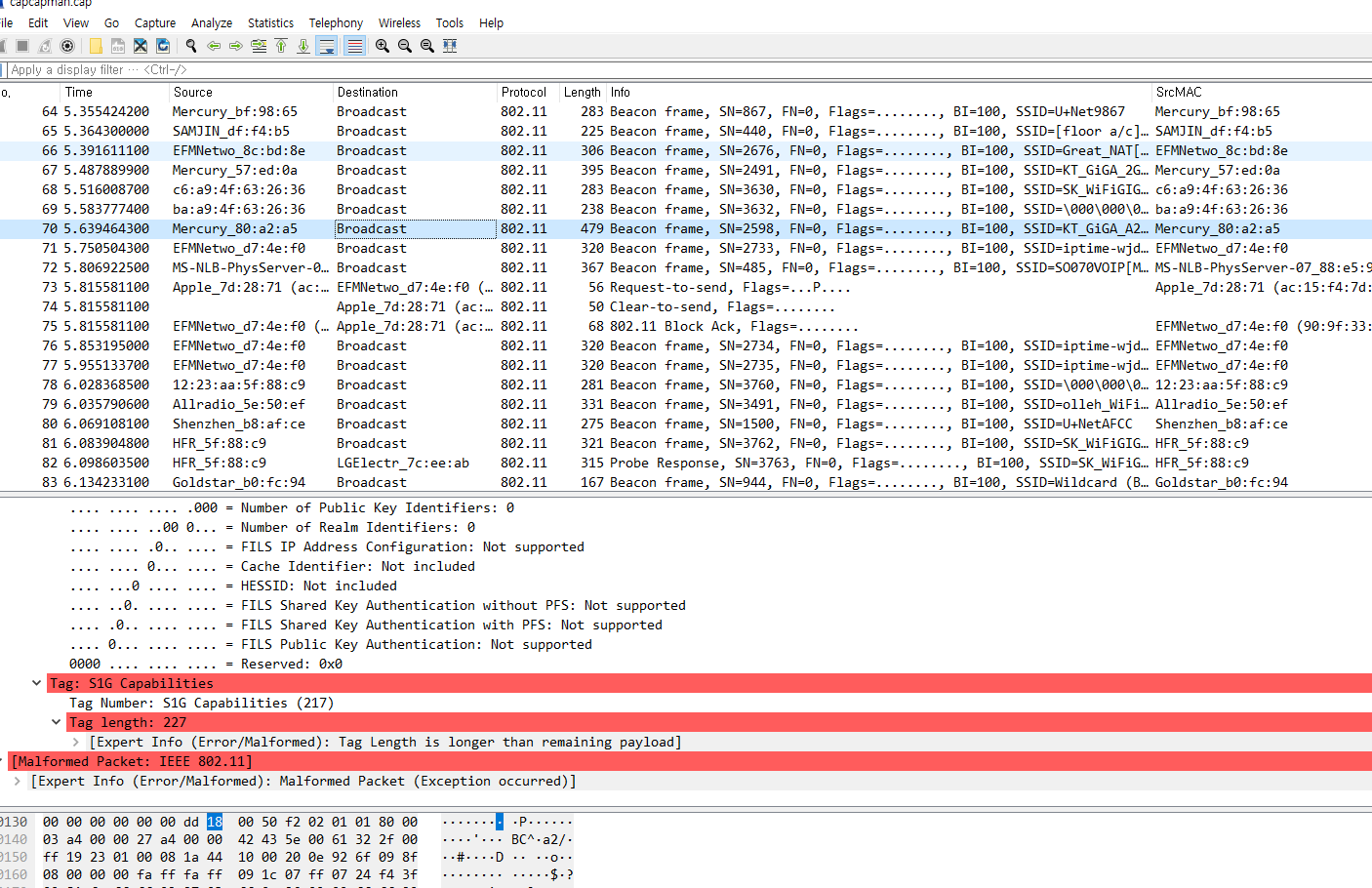 내가 놓친게 있나 싶어서 pcap 파일 형식으로 해당 바이너리를 재작성 후 와이어샤크에 올려보았더니 봐라, 저 불경한 빨간색을. 결론은 Iptime 사에서 표준을 미준수한 데이터를 덧붙여 비콘을 송신한것이 문제였다.