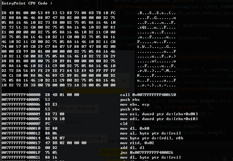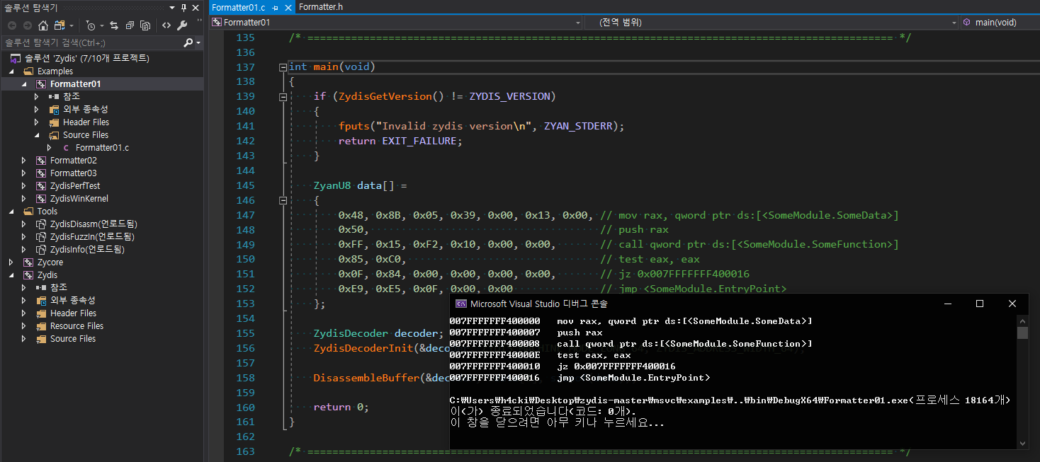 Zydis에 존재하는 예제코드들도 한번씩 빌드 해보면서 대충 뭐하는놈인지 겸사겸사 확인도 해보자. 아래 예제는 Formatter01 를 빌드해 실행한 화면이다.