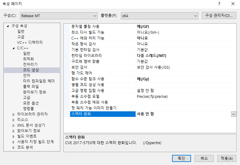 스펙터 완화 라이브러리가 없어 빌드가 되지 않는 경우도 많으므로 빌드중에 뜬금없이 링커 에러가 뜬다면 저녀석을 비활성화 해주는것은 굳이 말 안해도 알 것이다. 이제 빌드가 잘 될것이다.