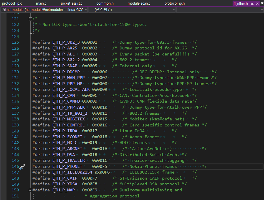 ETH_P_ALL 말고도 특정 종류의 프레임을 다루고 싶다면 이런 상수들을 사용 할 수 있다. if_ether.h 헤더파일에 정의 되어있으므로 인클루드 해서 사용 하도록 하자. 화면은 왠지 비주얼 스튜디오지만 리눅스용 코드 맞다. 비주얼스튜디오를 리눅스에 원격으로 붙여서 사용하는 방법은 아래 글을 참조 해보자.