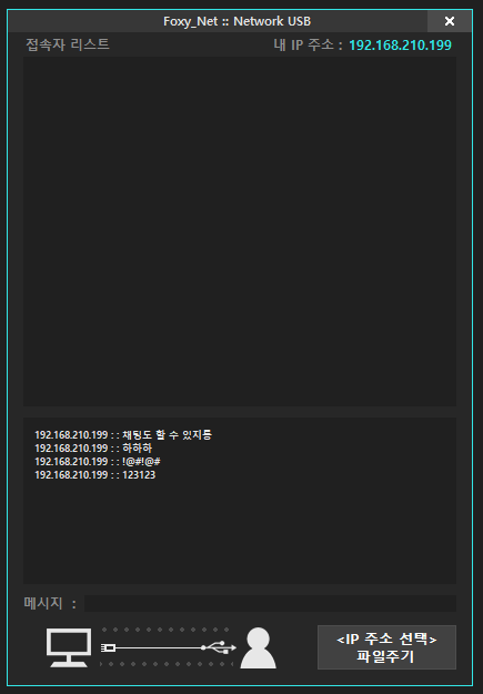LAN 상에서 이 프로그램을 서로 켜고 있으면, 접속자 IP 리스트가 위에 표시된다. 해당 리스트를 클릭하면, 밑쪽에 파일주기 버튼이 활성화 되고, 클릭 가능한 상태가 되는데, 이때 전송할 파일을 선택해서 전송 하면 된다.