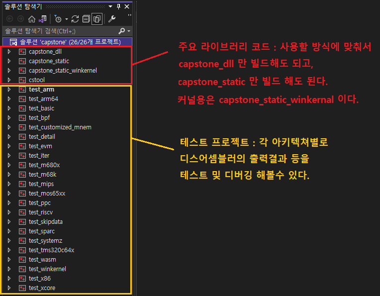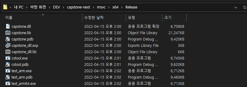 그대로 빌드 하면 아무 문제 없이 잘 빌드된다. static 라이브러리로 사용하고 싶으면 capstone_static 프로젝트, dll 링크 방식으로 사용하고 싶으면 capstone_dll 만 따로 빌드해도 된다. 잘 빌드 되었다면 아래와 같은 디렉터리에 출력물이 생긴다. 나는 64비트 릴리즈모드로 빌드 했으므로 ~capstone-master/msvc/x64/Release 경로에 출력되었다.