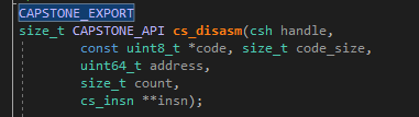 capstone 라이브러리는 cs_open 함수로 디스어셈블러를 초기화하고, cs_disasm 함수로 디스어셈블 한다.