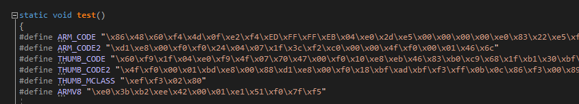 그럼 이번엔 테스트 프로젝트를 확인해보자. 이번엔 ARM 디스어셈블러를 테스트 해보자. test_arm.c 파일을 열어보면, 아래와 같이 임의의 기계어코드를 넣어 둔 것을 확인 할 수 있다. 실제로 사용할때엔, ELF, PE 등을 해석해서 엔트리포인트로부터 기계어코드를 해독 하면 될 것이다. ARM 에는 일반 운용모드와 THUMB 모드 등으로 전환될 수도 있는데, 이러한 모드들에도 전부 대응이 가능한 강력한 라이브러리이다.