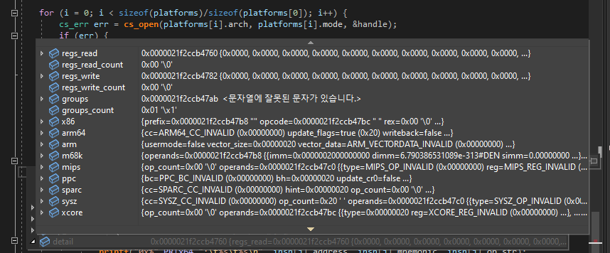 detail 멤버는 이러한 정보를 담고 있으며, x86 - arm64 - arm .... 부터 이어지는 멤버들은 union 으로 선언되어있다. 이 경우에는 ARM 32비트 코드에대한 인스트럭션이므로, arm 멤버만 참고하면 되고, 나머지 x86, arm64, mips 등등의 멤버는 유효하지 않으므로 무시하면 된다.