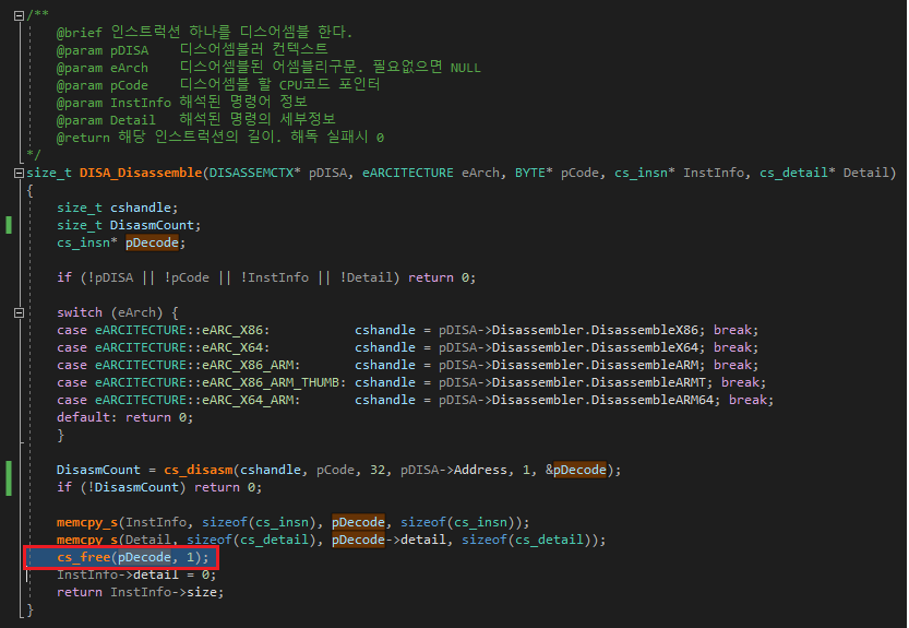 cs_disasm 함수는 해석한 인스트럭션 갯수를 반환하게 되는데, cs_free 할때도 이 값을 그대로 넘겨주면 누수는 없다.