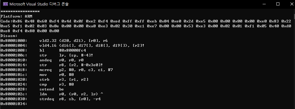 그럼 이번엔 테스트 프로젝트를 확인해보자. 이번엔 ARM 디스어셈블러를 테스트 해보자. test_arm.c 파일을 열어보면, 아래와 같이 임의의 기계어코드를 넣어 둔 것을 확인 할 수 있다. 실제로 사용할때엔, ELF, PE 등을 해석해서 엔트리포인트로부터 기계어코드를 해독 하면 될 것이다. ARM 에는 일반 운용모드와 THUMB 모드 등으로 전환될 수도 있는데, 이러한 모드들에도 전부 대응이 가능한 강력한 라이브러리이다.