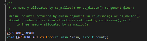 이런 정보를 잘 사용하고나면 이 insn 을 해제해주어야 한다. 내부적으로 cs_malloc 함수를 호출해서 할당받으므로, 이 과정을 빼먹으면 누수가 생길것이다. cs_free 함수로 해제하면 된다.